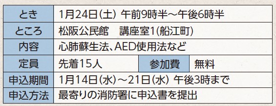 ※応急手当WEB講習を事前に受講された方は、講習時間が2時間短縮されます。詳しくは、松阪地区広域消防組合ホームページをご覧ください。