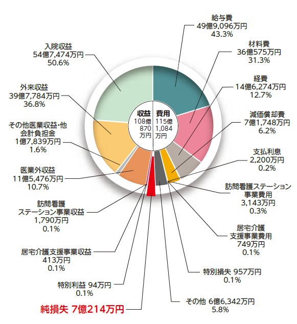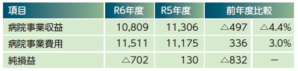 令和6年度は、受療動向の変化から予定より患者が減少し、医業収益が減少しました。また、人件費や物価の高騰も続き、費用が増加したことで病院の経営に更なる負担が生じました。これらの要因により、経営状態を好転させることが困難な1年間であり、十分な利益を確保することができず、赤字となりました。