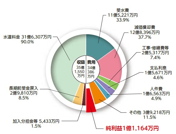 事業収益35億1,550万9,489円、事業費用34億386万2,658円となり、1億1,164万6,831円の純利益となりました。