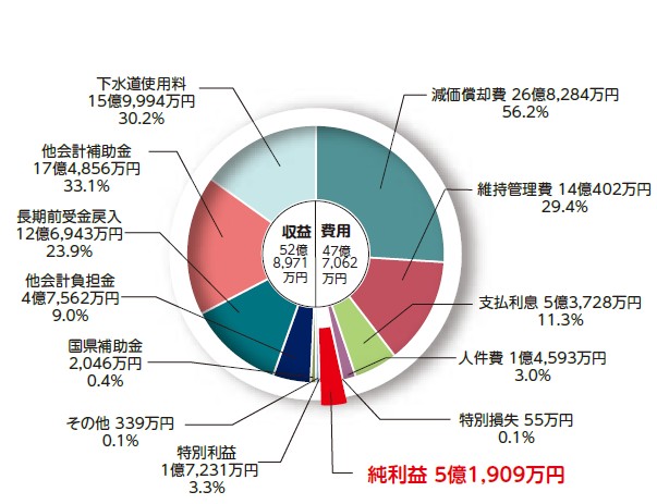 事業収益52億8,971万4,566円、事業費用47億7,062万2,508円で、5億1,909万2,058円の純利益となりました。快適な生活環境の確保、水質保全のために生活排水の処理を行っています。公共下水道への接続や合併浄化槽の使用など、皆様のご理解とご協力をお願いいたします。