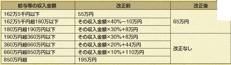給与等の収入金額から差し引かれる給与所得控除の最低保障額が10万円引き上げられます。