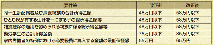 各種扶養控除等に係る所得金額の要件が以下のとおり10万円引き上げられます。