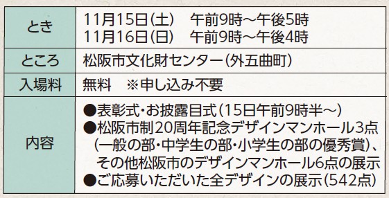 「松阪市の魅力」をテーマにデザインを募集したマンホールふたのお披露目とデザインの展示会を開催します。皆さんの力作をご覧いただき、マンホールのデザインから松阪市の魅力を感じてください!お披露目式参加者、アンケート回答者にデザインマンホールのマグネットをプレゼント!(1人1個、先着200人)
