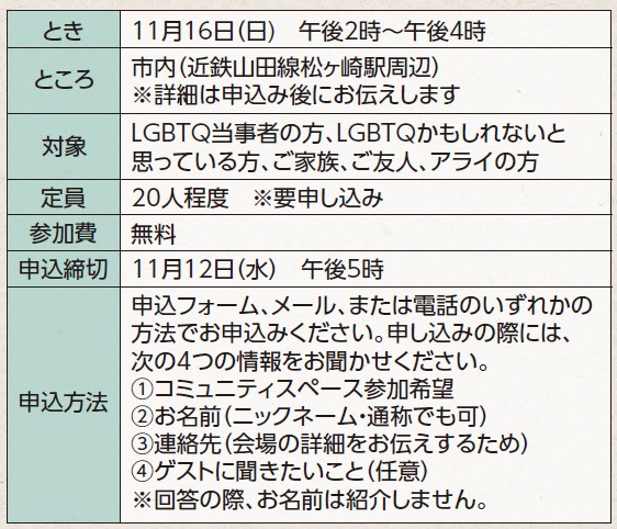 LGBTQ当事者の方、LGBTQかもしれないと思っている方、そのご家族やご友人の方々が交流できるスペースを開設します。