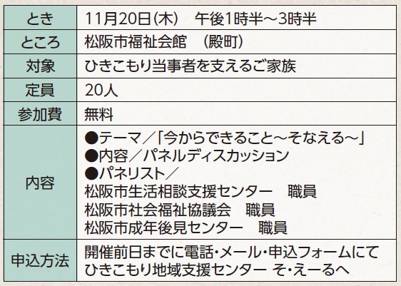 「家族のつどい」は、日々感じていることや、想いを共有し交流することができる場です。ひきこもりについてひとりで抱えず、同じような悩みを持つご家族で集まってさまざまな想いを分かち合ってみませんか。