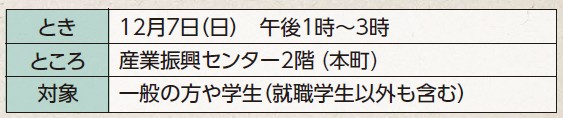 福祉や介護の仕事に関するブースを設置します。求人情報の収集や事業者への問い合わせや相談の場として是非、ご活用ください。