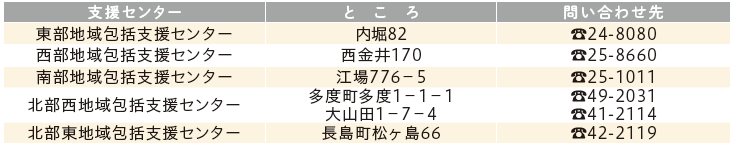地域で暮らす高齢者の介護・福祉・医療をさまざまな面から総合支援するため、本市には5つの地域包括支援センターがあります。各地域包括支援センターは以下のとおりです。