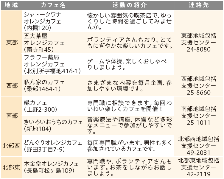 オレンジカフェ(認知症カフェ)は、認知症の人やご家族・地域住民・専門職などが集まり、認知症や介護の事などを気軽におしゃべりしたり、ご相談いただくことができる場です。市内にお住まいの人はどなたでも参加できますので、ぜひ皆さんとほっとするひとときを一緒に過ごしませんか。