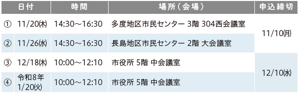 申込:電話または「住所、名前、連絡先、希望する講座日時」を記入し、郵送でスマートシティ推進課(〒511-8601 中央町2-37)へ。QRコード(本紙PDF版22ページ参照)からもお申し込みいただけます。
