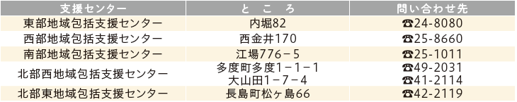 地域で暮らす高齢者の介護・福祉・医療をさまざまな面から総合支援するため、本市には5つの地域包括支援センターがあります。各地域包括支援センターは以下のとおりです。