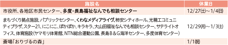 12/27(土)から1/4(日)まで市役所・各地区市民センターはお休みです。主な施設の年末年始のお休みは下記のとおりです。戸籍の届出などは、夜間・休日受付で休み中も受け付けます。