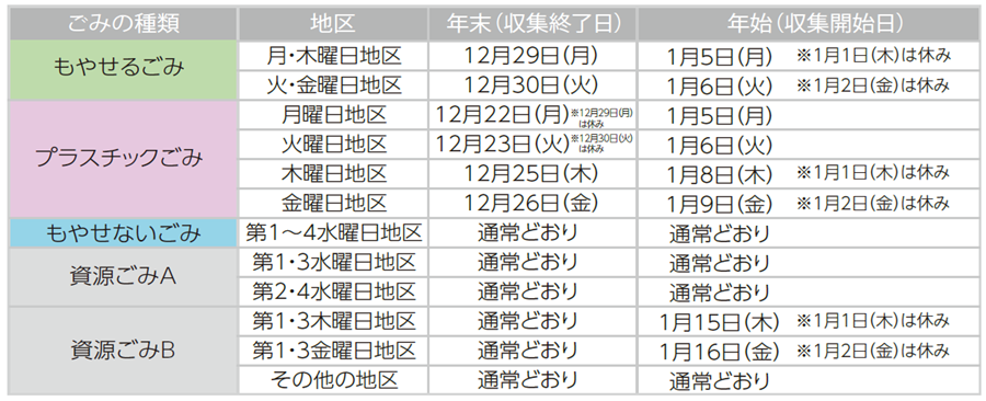 年始:1月5日(月)から(生ごみなどの腐敗性ごみのみ12月30日(火)まで、1月5日(月)から)