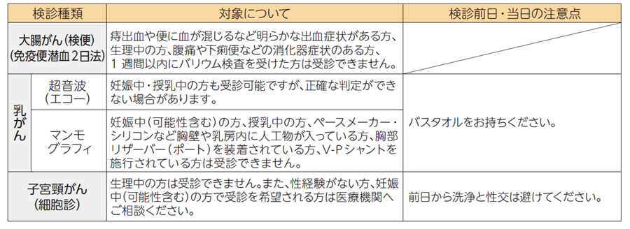 ※持病のある方は主治医にご相談ください。また、同じ種類の検診は、年度内に1回しか受けられません。