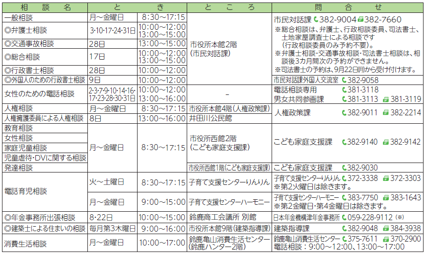 くらし 10月 相談 12/17 前の記事 次の記事 記事を読み上げる 発行日 : 2025年09月20日 自治体名 : 三重県鈴鹿市 広報紙名 : 広報すずか 2025年9月20日号(No.1684) ◎印は予約制です。 ※年金事務所出張相談の予約は、電話の音声ガイダンスに従い、1(相談の予約)→2(職員にご用の方は)の順に操作してください。 Tweet シェアする 公共施設予約システム 地域づくり研修生がつくる 地域のホットな情報をお届け 地域づくりNavi vol.45