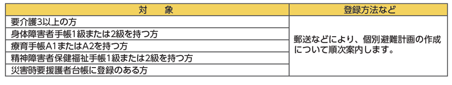 個別避難計画の作成対象になるのは、避難行動要支援者に該当する方です。