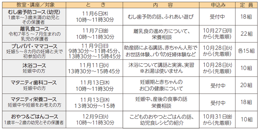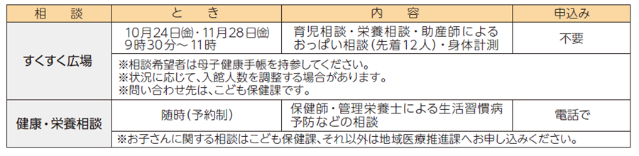 ※託児はありませんが、11/19(水)、12/4(木)・12/15(月)の検診時のみ職員による見守りを行います(予約不要)。