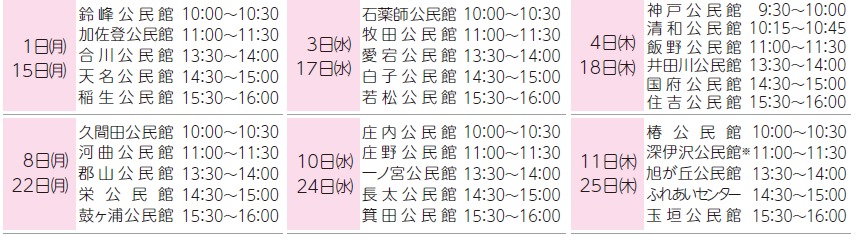 ※深伊沢公民館は11日(木)と23日(火)の11:00~11:30です。