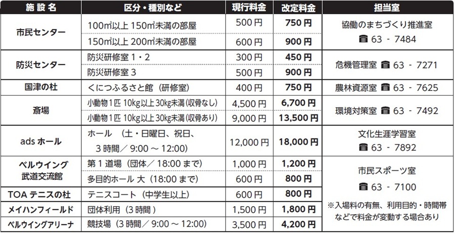 ※総合福祉センターふれあい、メイハンスタジアム、憩いの里ライフテクノフィールド、ターゲット・バードゴルフ場、薦原公園テニスコート・ソフトボール場、つつじが丘公園運動場、八幡二号公園運動場、新田ゲートボール場についても料金を改定します。