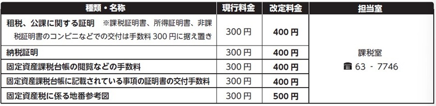 ※住民基本台帳の一部の写しの閲覧(件数要件の改定)、原動機付自転車・小型特殊自動車の標識紛失などによる弁償金、水張検査手数料、水圧検査手数料についても改定します。