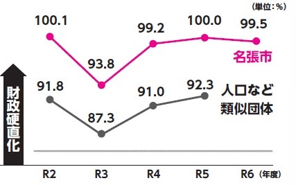 経常的な収入に占める、人件費や公債費、扶助費(社会保障関係費など)といった経常的な経費の割合(経常収支比率)をみると、令和6年度で99.5%となっています。市の財政構造が、依然として極度に硬直化した状態にあることを示しています。