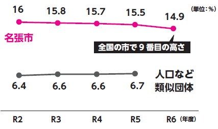 市債(借金)の返済額が、1年間の収入に対して、どのくらいの割合になるのかをチェックするのが「実質公債費比率」です。名張市の数値は14.9%で、全国792市で比較すると、9番目の高さ(速報値)となっています。