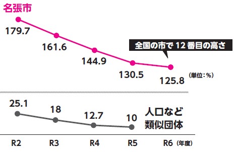 将来支払わなければならない負債が、年間の収入に対してどれくらいあるのかをチェックするのが「将来負担比率」です。名張市の数値は125.8%で、全国の市で12番目の高さ(速報値)となっています。