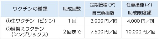 下の表の2種類のワクチンがあり、いずれか1種類について助成します。