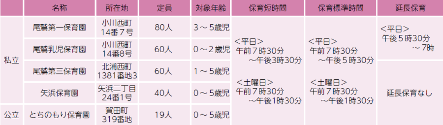 保育時間:市が認定した保育の必要時間によって保育短時間(8時間)か保育標準時間(11時間)に区分され、そのうち保護者の就労時間などに合わせて利用することができます。