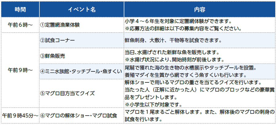 当日は本会場での式典行事を中継するモニターの設営、また、放流スペースも設営し、随時マダイの放流を行います。例年通りの家族で楽しめるイベントや尾鷲のお魚を無料で振る舞いますので、皆さんぜひお越しください!