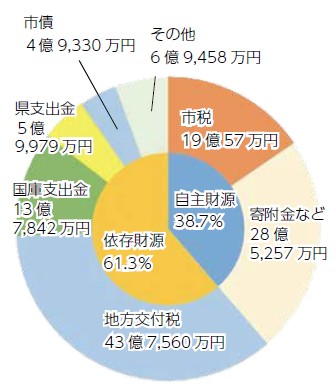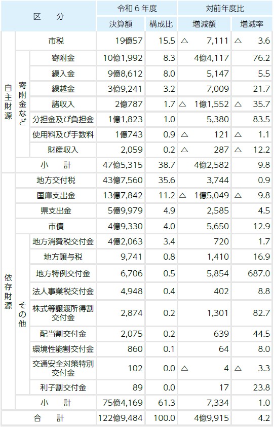 歳入の主なものを前年度と比較すると、自主財源では、主に寄附金が増加したことにより、全体で4億2,582万円(9.8%)の増加となりました。依存財源では、主に地方特例交付金が増加したことにより、7,334万円(1.0%)の増加となりました。