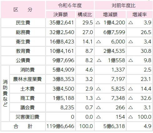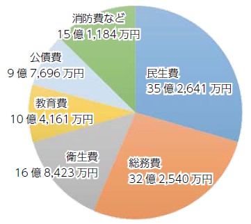 歳出を前年度と比較すると、総務費は国市浜公園整備等基金積立金の増加などにより、6億7,599万円(26.5%)増加し、教育費では多目的スポーツフィールド整備事業の増加などにより、2億4,535万円(30.8%)増加となりました。
