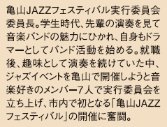 「いつかは東町商店街を歩行者天国にして、食べて、飲んで、笑いながらいろいろなジャンルの音楽を聴けるようなイベントにしていきたい。県内外からたくさんの人がジャズを楽しむために亀山を訪れてほしい」。メンバーの夢は膨らみます。次回の開催に向けた準備は、もう始まっています。