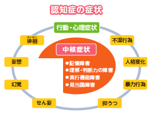 認知症は、なんらかの原因で脳の細胞が死んでしまったり、働きが悪くなったりすることで、これまでの記憶や考えるなどの認知機能が低下し、日常生活を送るうえで支障が出てくる状態のことをいいます。症状は、もの忘れ・被害妄想・幻視(見えないはずのものが見える)など、一人ひとり違います。