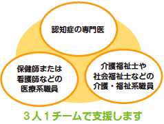 市では、認知症を早期発見・対応するため、認知症の知識を持つ医師・医療職・福祉職員からなるチームを編成しています。