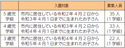 ▽かもめ幼稚園入園対象・募集人員一覧表