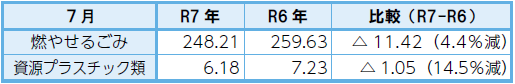 ▽7月の燃やせるごみと資源プラスチック類の収集量(単位:トン)