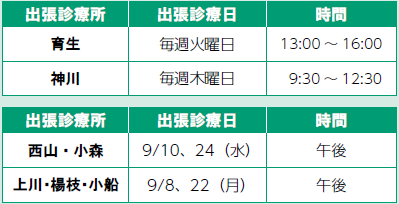 ※巡回診療につき、診療時間帯が変動しますので、紀和診療所にお問い合わせください。