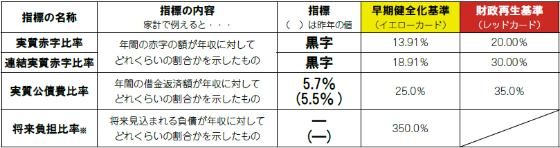 ※将来負担比率については、貯金額(基金残高)などが借金額(市債残高)を上回るため「-」と表示しています。