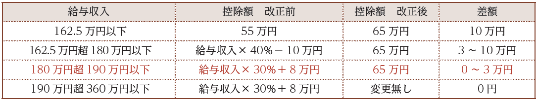 給与収入金額が190万円以下の人について給与所得控除の最低保証額が最大10万円引き上げられます。