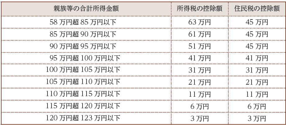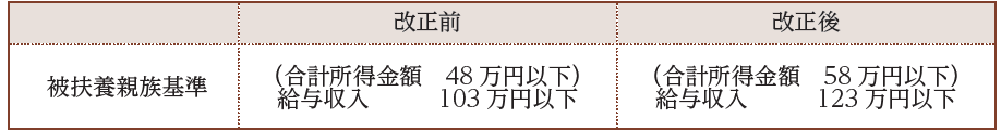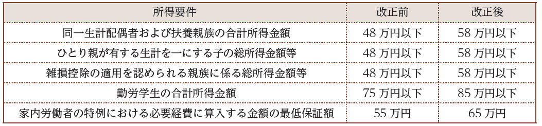 各種扶養控除等に係る合計所得金額の所得要件が以下のとおり10万円引き上げられます。