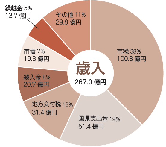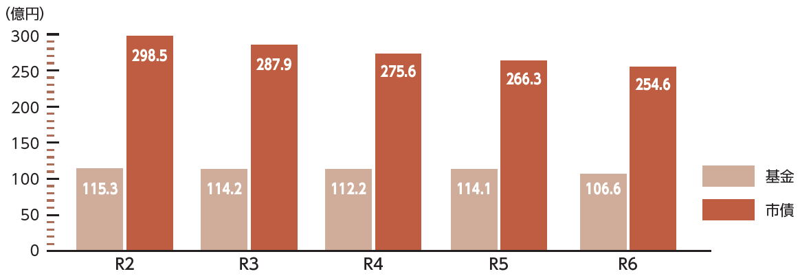 基金残高(一般会計)は、前年度から7億5千万円減少して106億6千万円となりました(図2)。また、市債残高(一般会計)は、借入より償還が多かったため、前年度から11億7千万円減少して254億6千万円となりました。市債残高のうち197億2千万円の償還費用は、国からの地方交付税で措置されます。