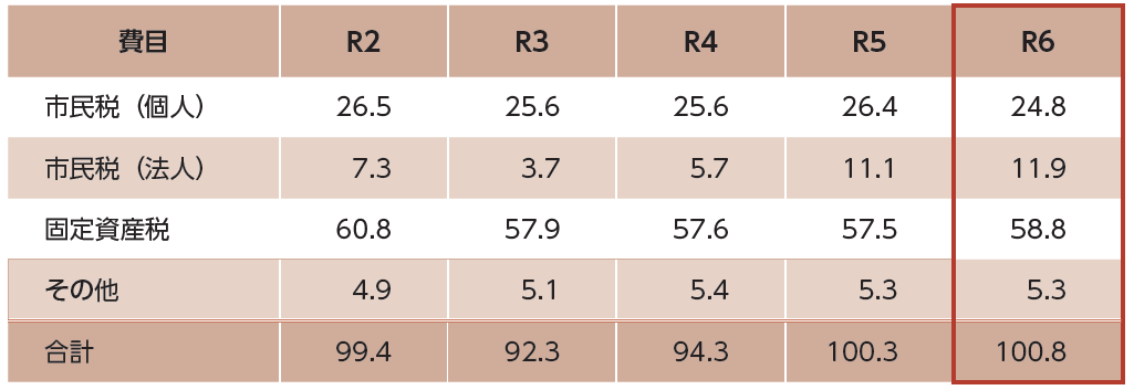 市税収入額は前年度より5千万円多い100億8千万円となりました(表2)。企業の設備投資が前年度に比べ増加したことにより、固定資産税が1億3千万円増加したことが主な要因です。
