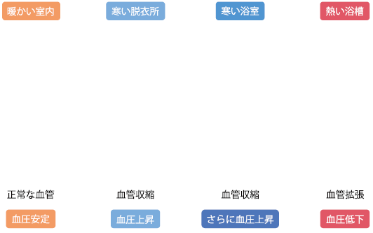 例えば、暖かい部屋から寒いところに移動すると、寒冷刺激により血管が縮まり血圧が一気に上昇します。その後、体が温まり、血管が広がることで急激に血圧が下がります。また、入浴後の脱衣所が寒いと血圧が上昇するなど、急な温度変化が原因となります。
