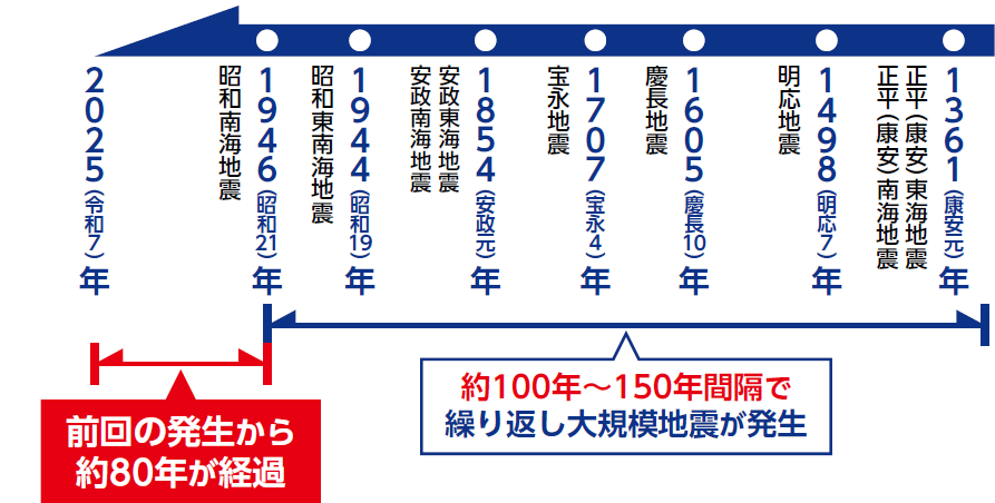 前回の東南海地震(昭和19年)、南海地震(昭和21年)が発生してから約80年が過ぎ、次の南海トラフ地震がいつ起こってもおかしくない状態です。