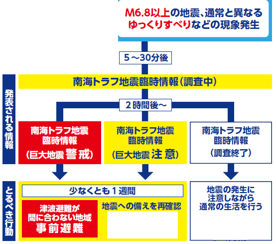 南海トラフ地震臨時情報は、南海トラフ地震の想定震源域で大規模地震が発生する可能性が平常時より高まっていると評価された場合などに気象庁から発表されます。