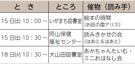 絵本の読み聞かせや紙芝居、手遊びなどをします。(30分~1時間程度)