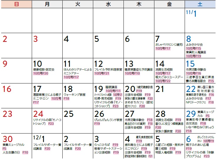 くらし 広報カレンダー 26/28 前の記事 次の記事 発行日 : 2025年11月07日 自治体名 : 三重県東員町 広報紙名 : 広報とういん 令和7年11月号 ・広報とういん発行時点での予定ですので、変更になる場合があります。町民カレンダーと併せてご活用ください。 ・カレンダー掲載の行事については、各担当課へお尋ねください。 Tweet シェアする おみごとVEERTIEN Vol.62 今月の納付は
