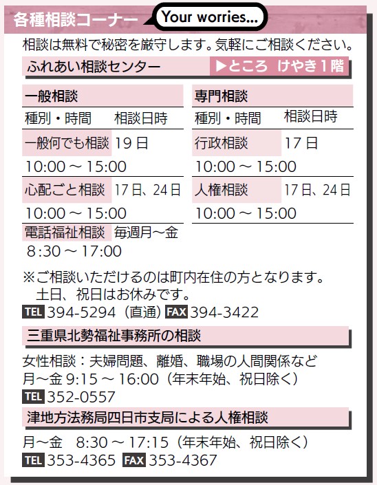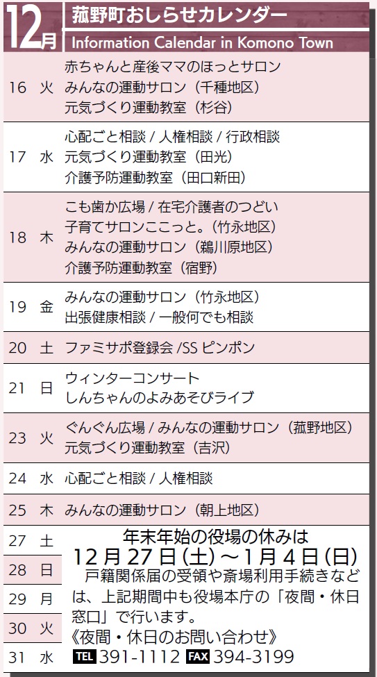くらし 12月菰野町おしらせカレンダー・各種相談コーナー・12月の納付 9/14 前の記事 次の記事 発行日 : 2025年12月01日 自治体名 : 三重県菰野町 広報紙名 : 広報こもの 令和7年12月号 ■12月菰野町おしらせカレンダー ■各種相談コーナー 相談は無料で秘密を厳守します。気軽にご相談ください。 ■12月の納付 ・固定資産税3期 ・国民健康保険税6期 Tweet シェアする おしらせ版 2025年12月後半号(3) としょかんいんふぉ