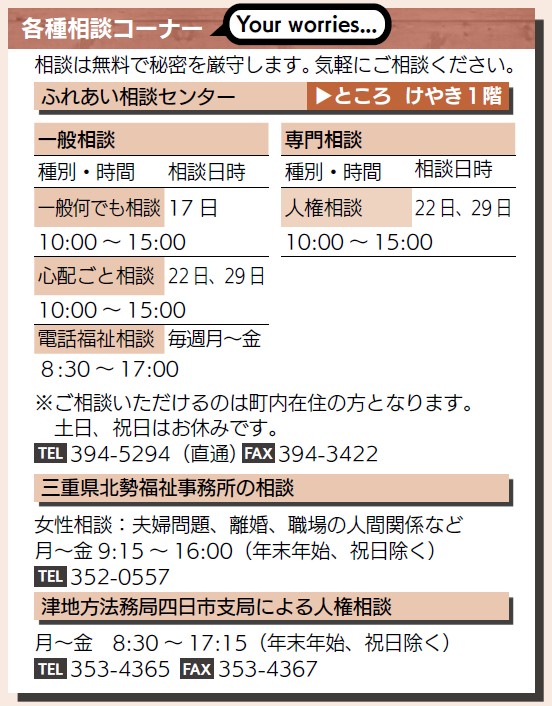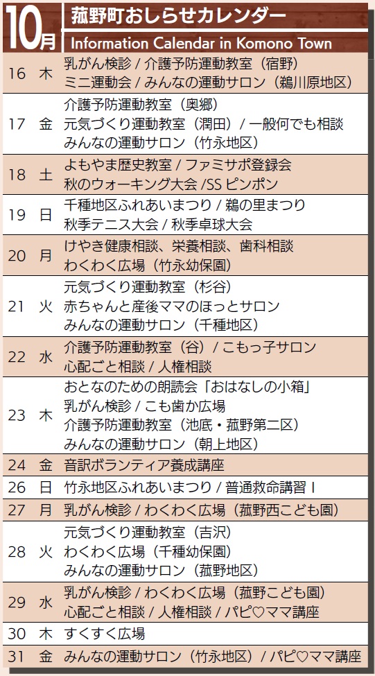 くらし 10月菰野町おしらせカレンダー・各種相談コーナー・10月の納付 9/14 前の記事 次の記事 発行日 : 2025年10月01日 自治体名 : 三重県菰野町 広報紙名 : 広報こもの 令和7年10月号 ■10月菰野町おしらせカレンダー ■各種相談コーナー 相談は無料で秘密を厳守します。気軽にご相談ください。 ■10月の納付 ・町県民税3期 ・国民健康保険税4期 Tweet シェアする おしらせ版 2025年10月後半号(3) としょかんいんふぉ