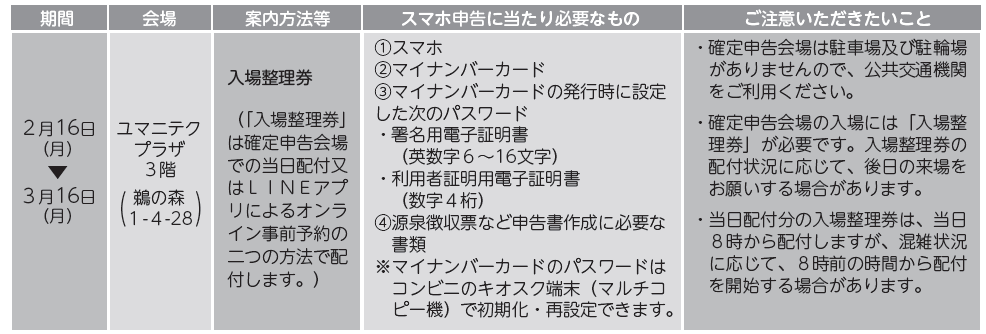 入場整理券の配付状況に応じて、翌日の来所(2月3日のみ)又は税務署の確定申告会場への来場をお願いする場合がありますので、ご了承ください。